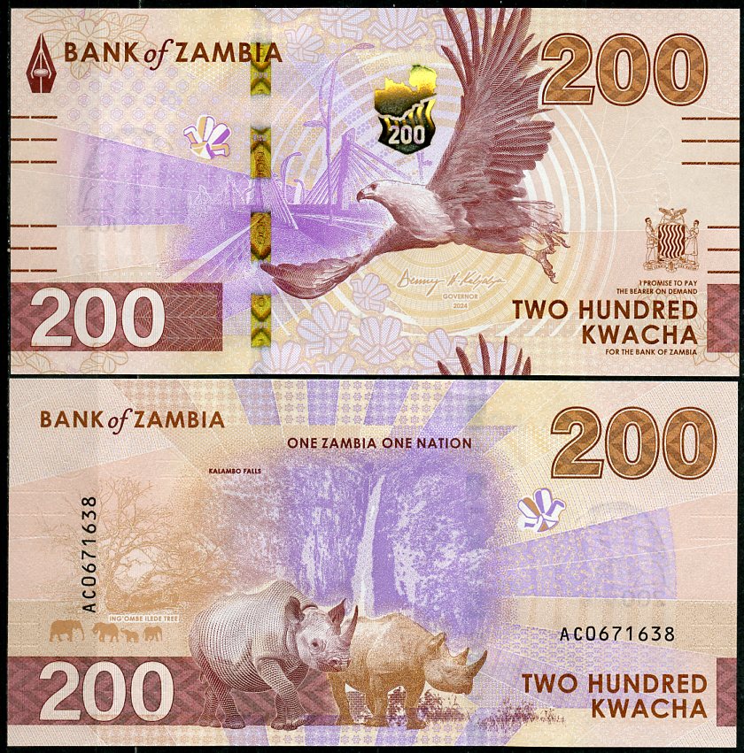 Замбия 200 квача 2024 орел, мост Казунгула, водопад, носорог Pick 66 бумага UNC (пресс) 448-125-3
