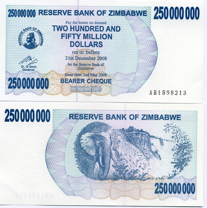 Зимбабве 250000000 долларов 2008 31 декабря 2008, слон, водопад Виктория Pick 59 бумага UNC (пресс) 448-53-1