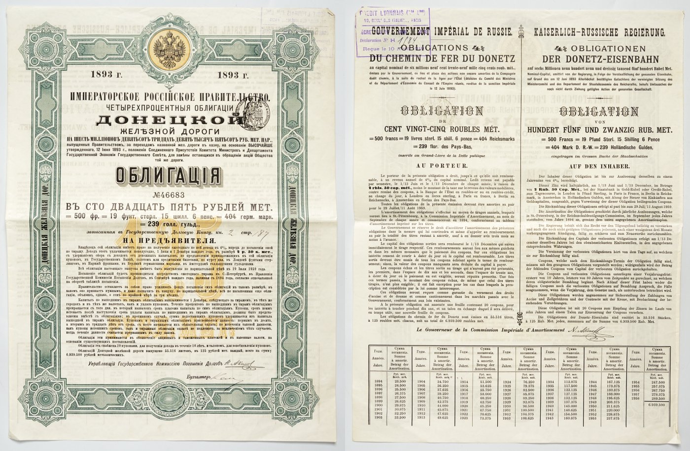 Россия 4% облигация в 125 рублей металлических 1893 Донецкая железная дорога бумага 5547-19-1-1