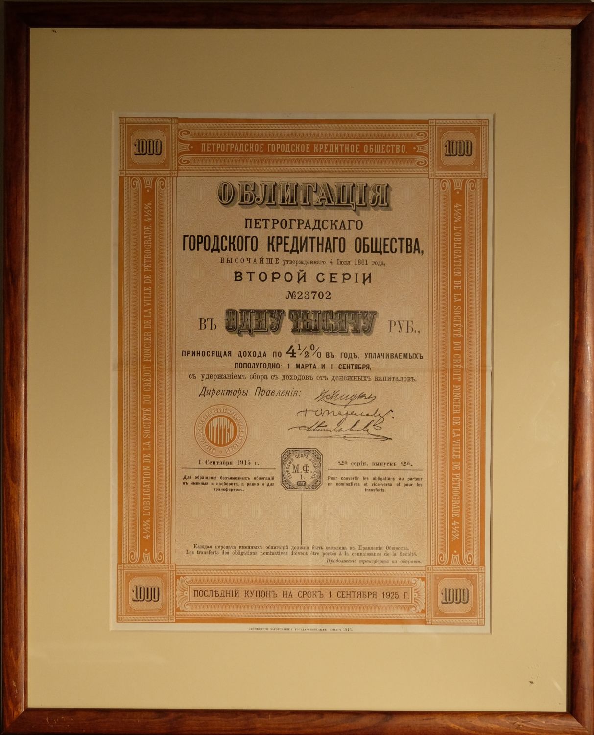 Россия Петроградское городское кредитное общество. Облигация в 1000 рублей 1915 красочное оформление, рамка, паспарту бумага st-002