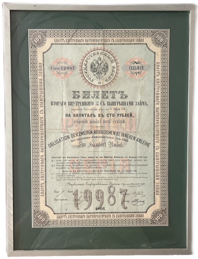 ---Россия 100 рублей 1866 Второй внутренний 5% с выигрышами займ, красочное оформление, рамка, паспарту бумага KAB-003НовинкиАнтичность и раннее СредневековьеМонеты - ГерманияМонеты - ЕвропаМонеты - Австралия и ОкеанияМонеты - АзияМонеты - АмерикаМонеты - АфрикаМонеты - Россия, СССР, страны СНГ и БалтииБанкнотыАксессуары, ЛитератураОткрытки, карточкиАкции, облигацииЖетоны, Медали, ЗнакиМаркиКартины, декоративно-прикладное искусство