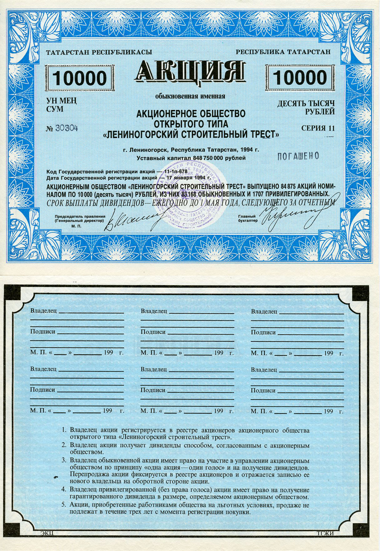 Россия, республика Татарстан обыкновенная акция в 10000 рублей Акционерное общество открытого типа "Лениногорский строительный трест" 1994 выпущено 84875 акций бумага 8804-133-1