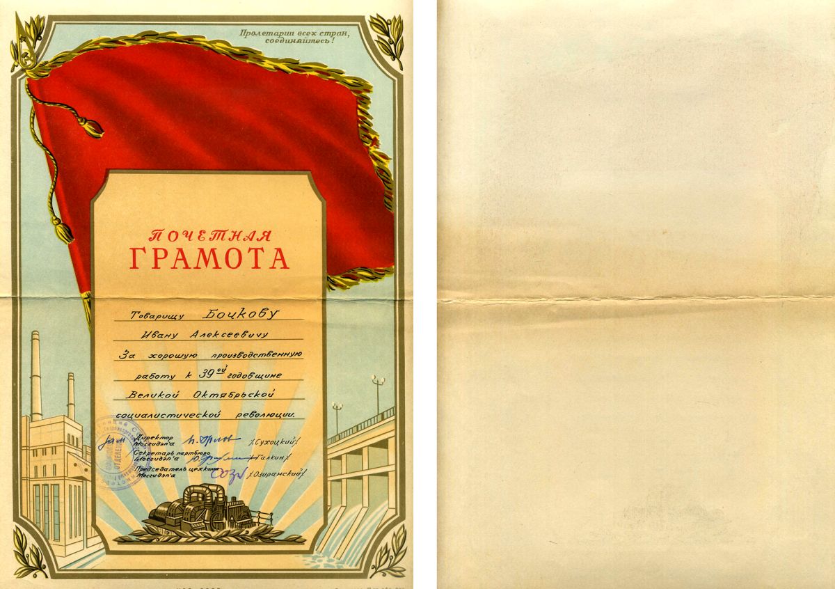 -----МЭС-СССР почетная грамота за хорошую производственную работу к 39-ой годовщине Великой Октябрьской социалистической Революции 1956 23,5x33,5 см бумага 5554-10-1-1