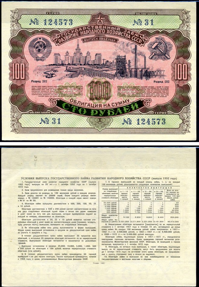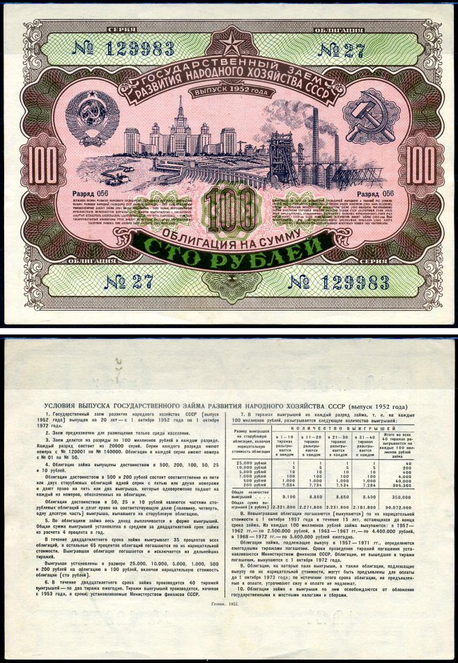 -----СССР облигация на 100 рублей 1952 государственный заем развития народного хозяйства СССР, разряд 056 Золотарев 52.1.4 бумага aUNC 7547-16-3-2