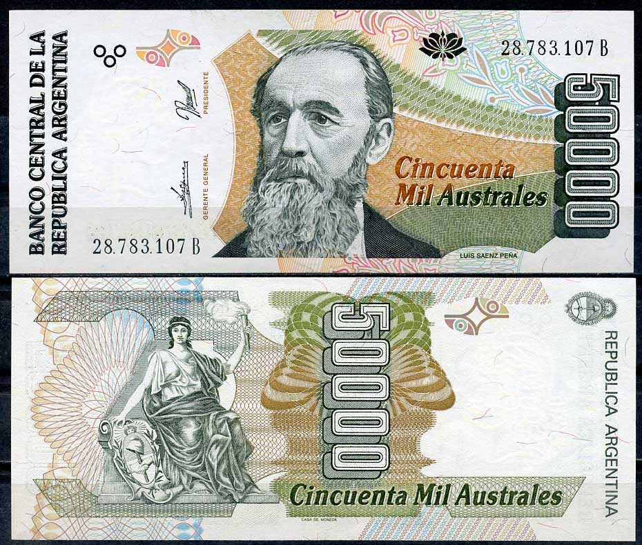 Аргентина 50000 аустралей ND (1990) серия 28793, Луис Саэнс Пенья, статуя прогресса Pick 335 a бумага UNC (пресс) 451-547-2