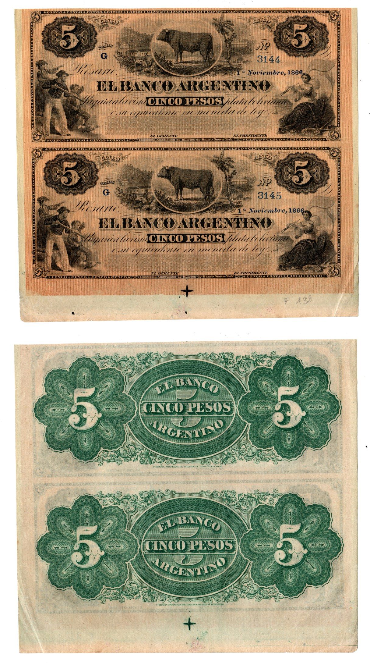 Аргентина, Росарио 5 песо 1866 неразрезанные банкноты. Гаучо, бык, аллегорическая женщина Pick S1526 b бумага 451-1262-1