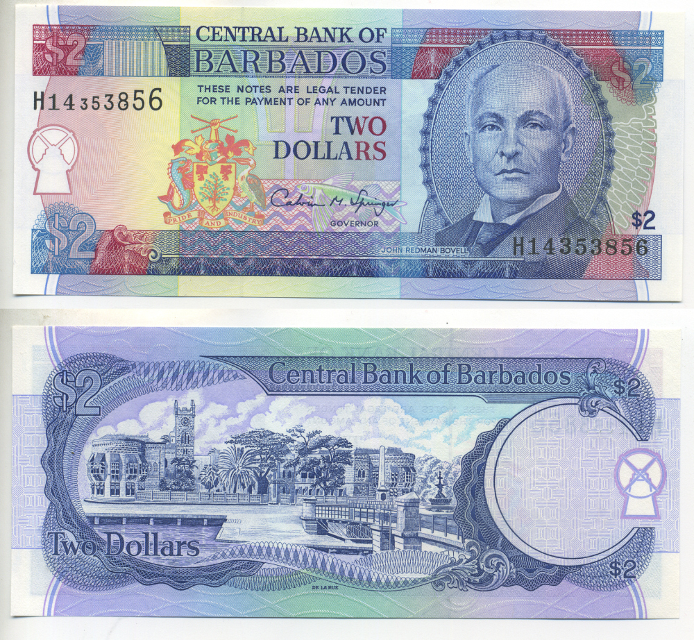 БАРБАДОС 2 ДОЛЛАРА 1995 ДЖОН РЕДМАН БОВЕЛЛ, ТРАФАЛЬГАРСКАЯ ПЛОЩАДЬ В БРИДЖТОУНЕ, ПОДПИСЬ SPRINGER Pick 46 бумага UNC (ПРЕСС) 7457-16-1