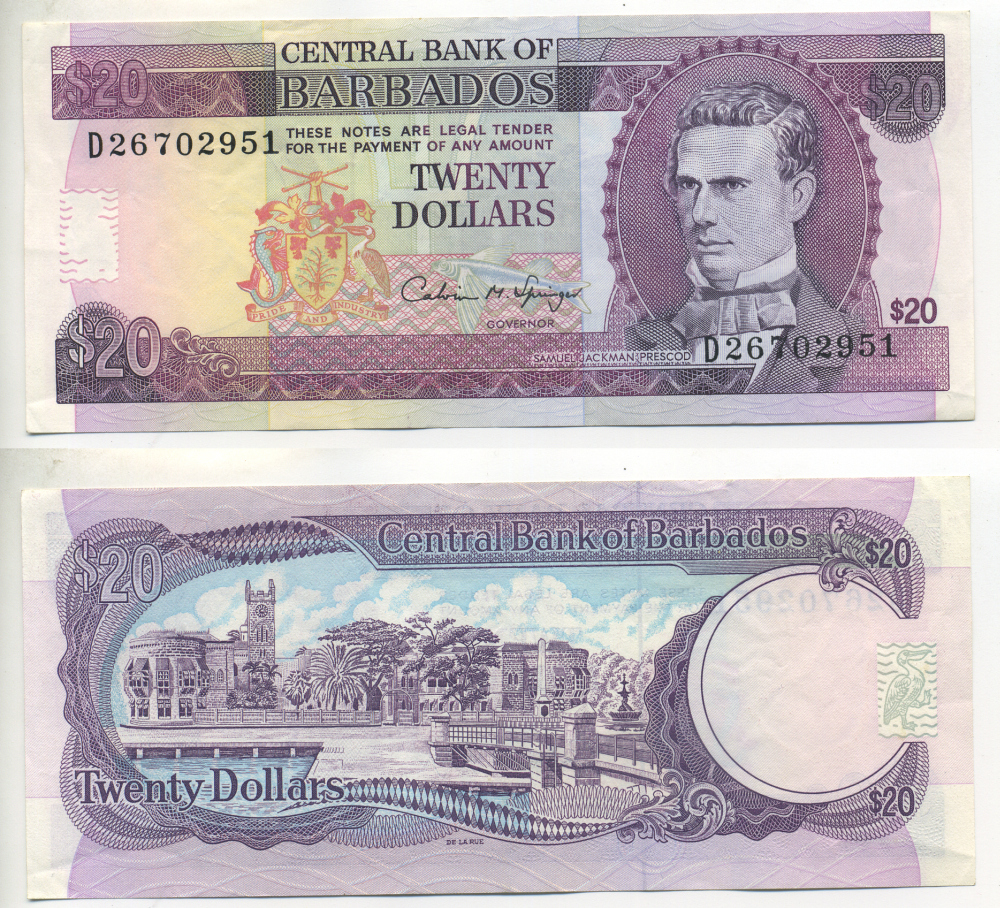 БАРБАДОС 20 ДОЛЛАРОВ 1993 ПОДПИСЬ SPRINGER, САМУЭЛЬ ДЖЕКМАН ПРЕСКОД Pick 44 бумага VF-XF 7457-17-1