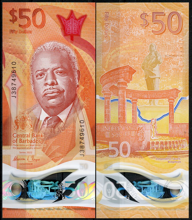 Барбадос 50 долларов 2022 Эррол Бэрроу, площадь независимости Pick 84 пластик UNC (пресс) 451-715-2