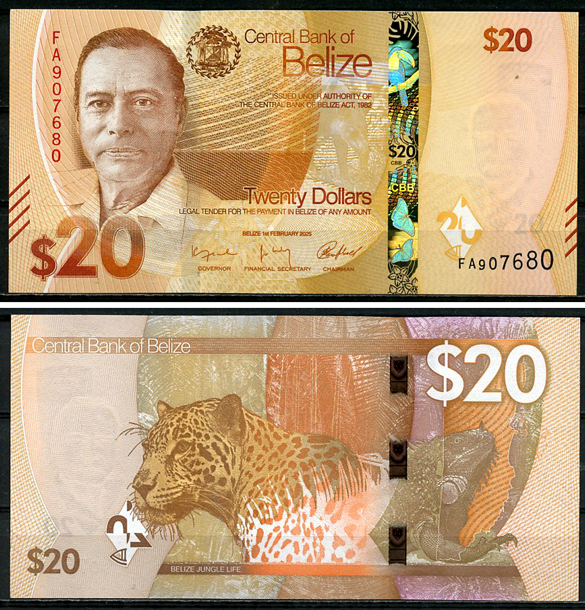 Белиз 20 долларов 2025 Джордж Кэдл Прайс, ягуар, зеленая игуана Pick 76 бумага UNC (пресс) 446-47-3