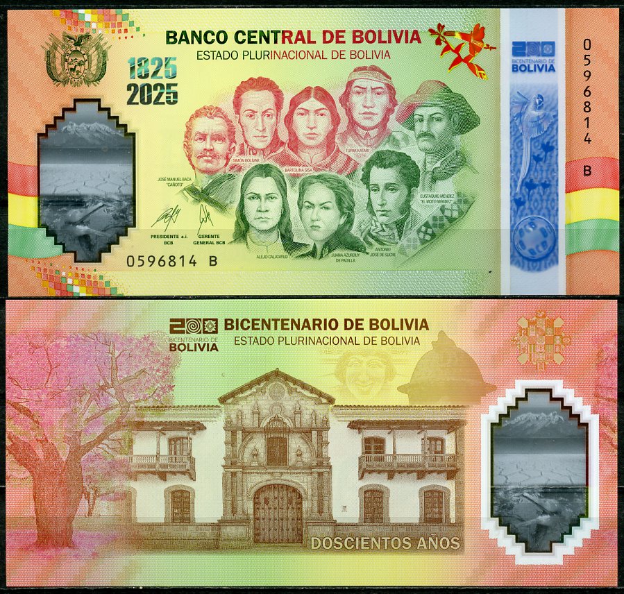Боливия 200 боливиано 2025 200 лет Боливии, национальные герои Pick 253 a пластик UNC (пресс) 451-1187-2