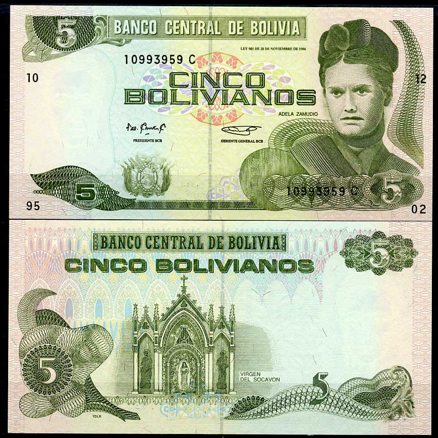 -Боливия 5 боливиано 1986 Адела Самудио, церковь Девы Сокавон, серия C, TDLR Pick 215 a бумага UNC (пресс) 00-00АргентинаСШАКолумбияКоста-РикаКубаМексикаНидерландские АнтилыНикарагуаПарагвайПеруСуринамКанадаТринидад и ТобагоУругвайЧилиЭквадорЯмайкаВосточно-Карибские штатыГренландияКаймановы островаБермудские острова (Бермуды)Багамские островаДоминиканская РеспубликаБарбадосБелизБразилияВенесуэлаГаитиГайанаГватемалаГондурасДругие страны
