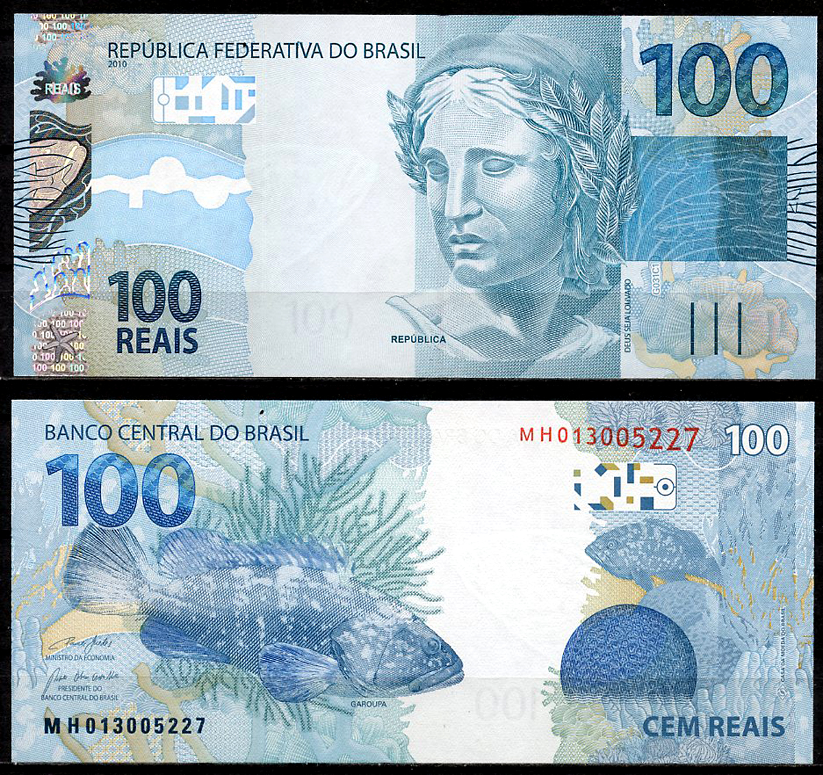 Бразилия 100 реалов 2010 голова Республики, групер Pick 257 f бумага UNC (пресс) 451-436-2