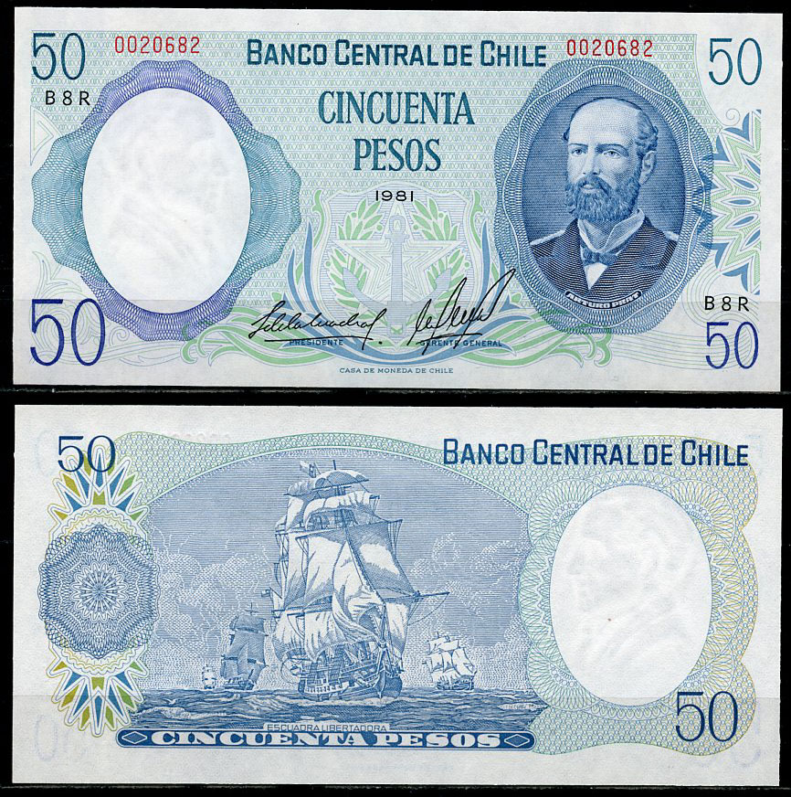 Чили 50 песо 1981 Артуро Прат, Префикс R, replacement - замещенная серия Pick 151b r бумага UNC (пресс) 447-34-3-2