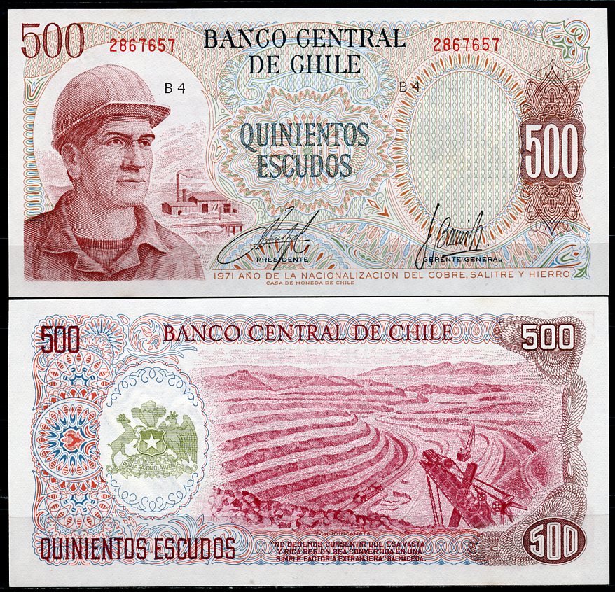 Чили 500 эскудо 1971 рабочий медных рудников, добыча медной руды в Чукикамате Pick 145 (1) бумага UNC (пресс) 451-804-2