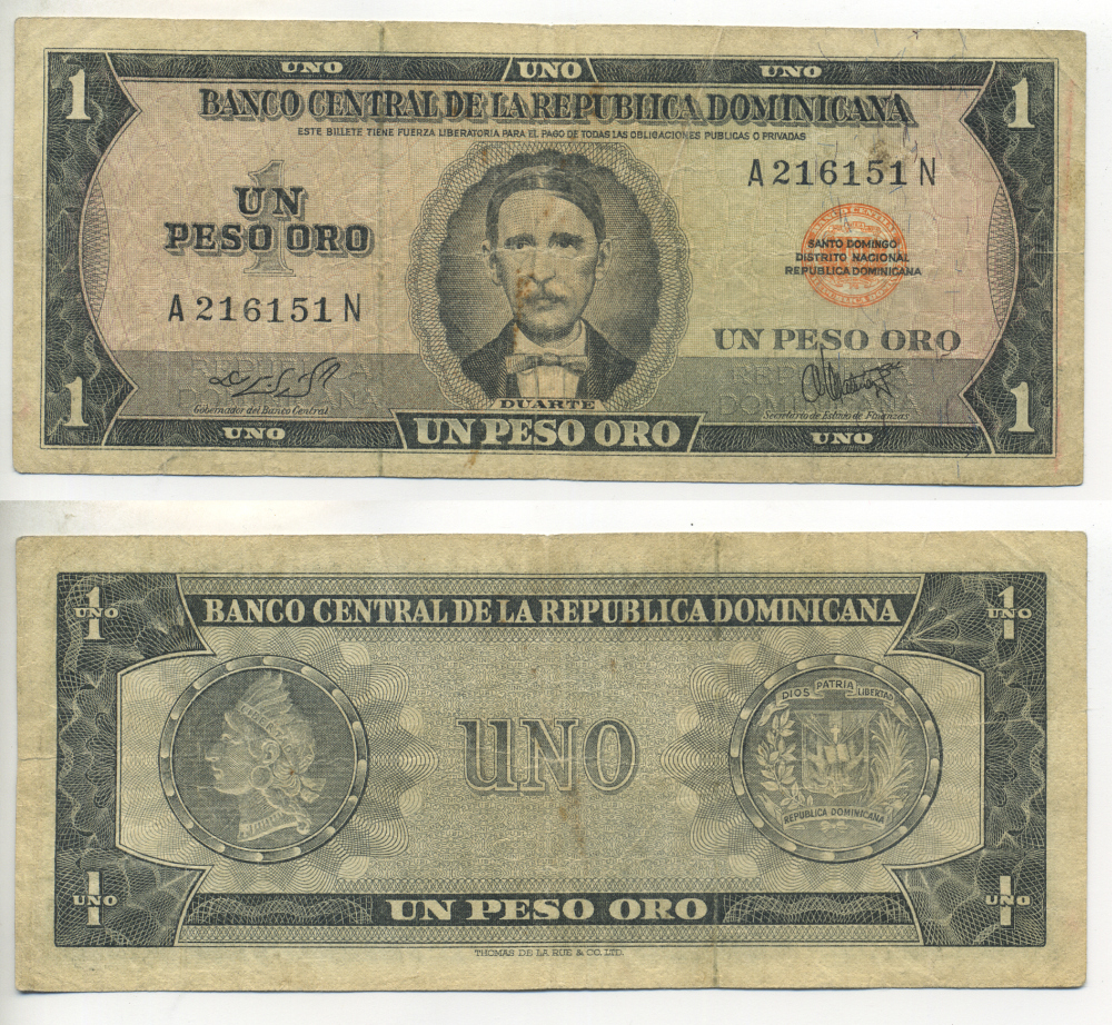 ДОМИНИКАНСКАЯ РЕСПУБЛИКА 1 ПЕСО 1973-1974 ПОРТРЕТ ДУАРТЕ, ПРИНТ TDLR Pick 107a бумага 7457-26-2