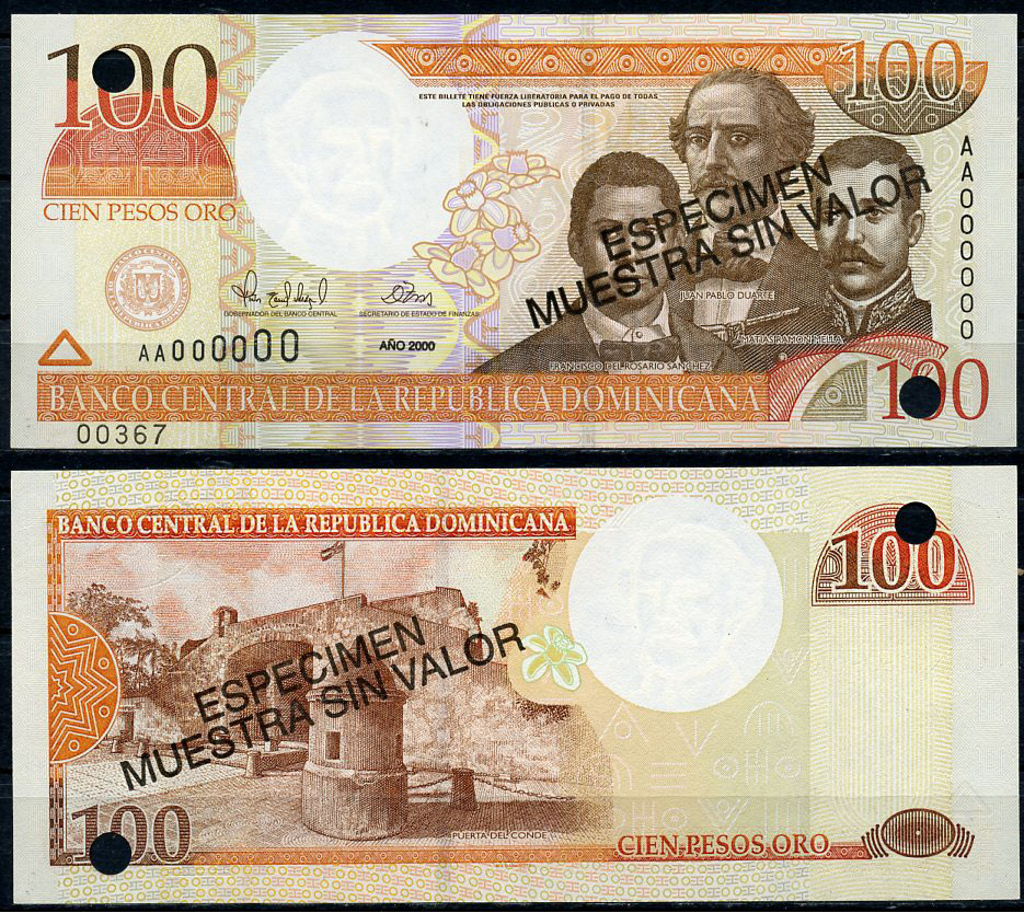 Доминиканская Республика 100 песо 2000 Пуэрта-дель-Конде в Санто-Доминго, Пабло Дуарте, Франциско Санчес, Матас Рамон. "Образец". С диагональной надпечаткой слова "Especimen" и перфорационными отверстиями Pick 167 a s бумага UNC (пресс) 451-678-1