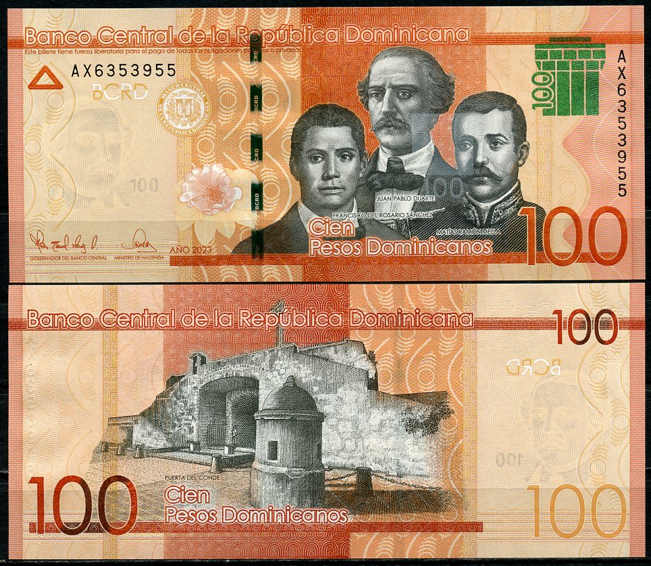 -Доминиканская Республика 100 песо 2023 Пуэрта-дель-Конде в Санто-Доминго, три портрета Пабло Дуарте, Франциско Санчес, Матас Рамон. Отцы основатели Pick 190 h бумага UNC (пресс) 447-40-2АргентинаСШАКолумбияКоста-РикаКубаМексикаНидерландские АнтилыНикарагуаПарагвайПеруСуринамКанадаТринидад и ТобагоУругвайЧилиЭквадорЯмайкаВосточно-Карибские штатыГренландияКаймановы островаБермудские острова (Бермуды)Багамские островаБарбадосБелизБоливияБразилияВенесуэлаГаитиГайанаГватемалаГондурасДругие страны