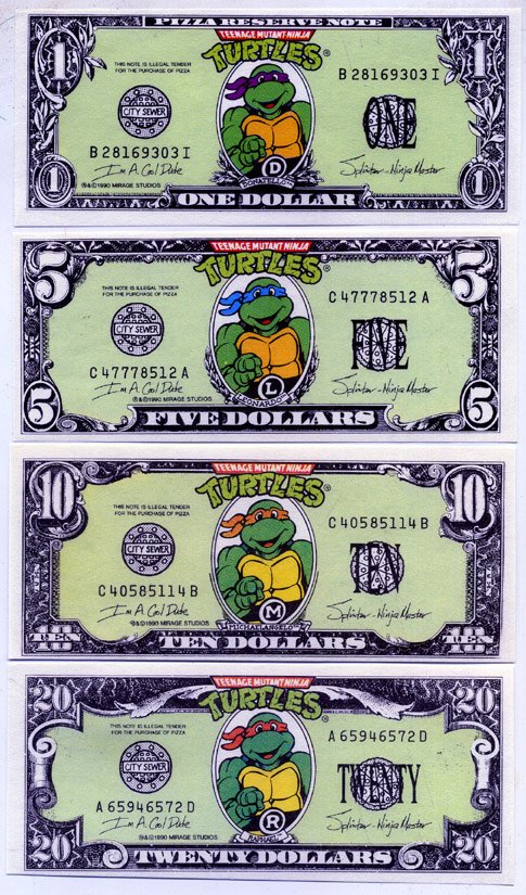 АМЕРИКА НАБОР ИЗ 4 БАНКНОТ ND (1, 5, 10, 20 ДОЛЛАРОВ) ЧЕРЕПАШКИ НИНЗЯ ОДНОСТОРОННИЙ ЦВЕТНОЙ ПРИНТ 113Х49 бумага UNC (ПРЕСС) 7146-60-2-1
