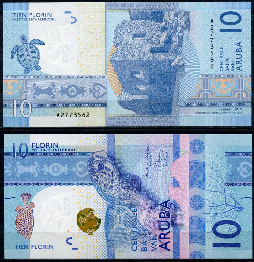 Аруба 10 флоринов 2019 Руины золотой мельницы Буширибана, черепаха Pick 21 бумага UNC (пресс) 447-61-3