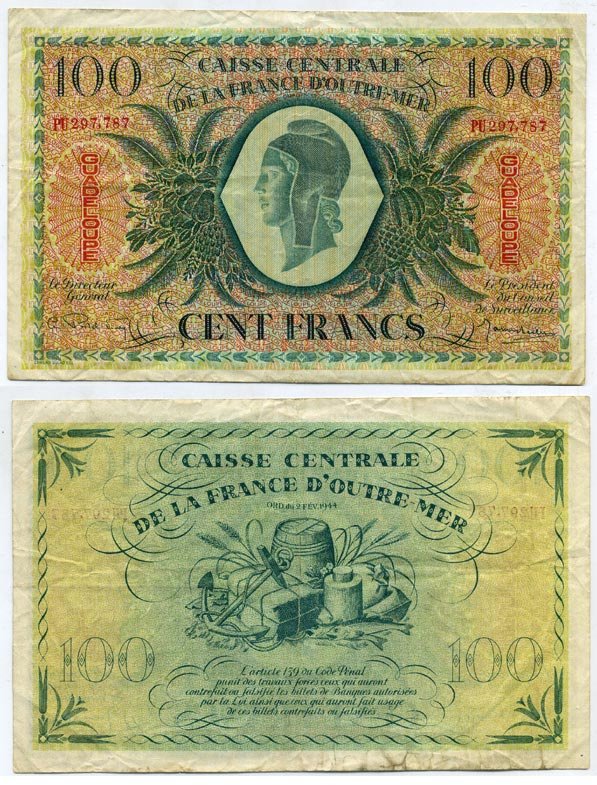Гваделупа 100 франков 1944 товары для торговли Pick 29 а бумага 451-240-2