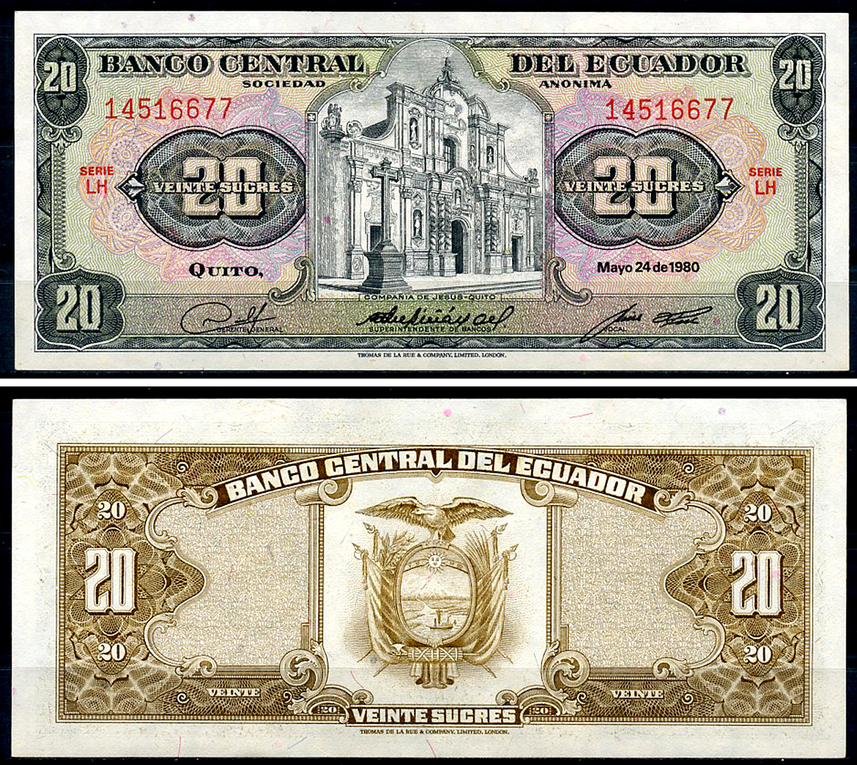 Эквадор 20 сукре 1980 Церковь Общества Иисуса, серия LH Pick 115 b (1980 (8)) бумага aUNC 6294-64-3-2