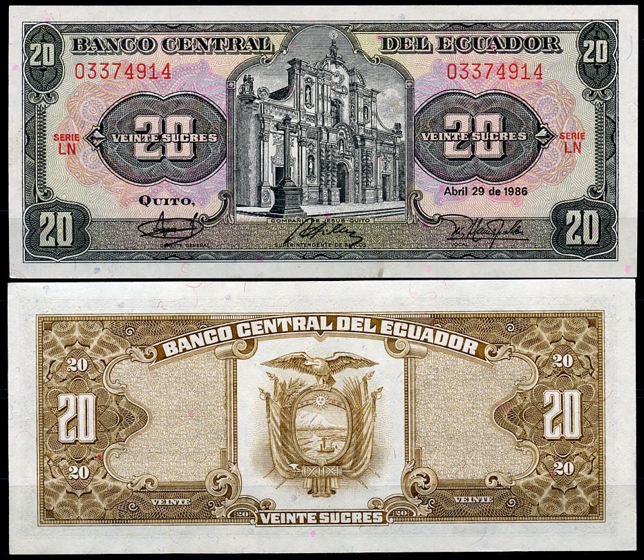 -Эквадор 20 сукре 1986 Церковь Общества Иисуса, серия LN Pick 121A a (1986 (3)) бумага UNC (пресс) 447-130-1АргентинаСШАКолумбияКоста-РикаКубаМексикаНидерландские АнтилыНикарагуаПарагвайПеруСуринамКанадаТринидад и ТобагоУругвайЧилиЯмайкаВосточно-Карибские штатыГренландияКаймановы островаБермудские острова (Бермуды)Багамские островаДоминиканская РеспубликаБарбадосБелизБоливияБразилияВенесуэлаГаитиГайанаГватемалаГондурасДругие страны