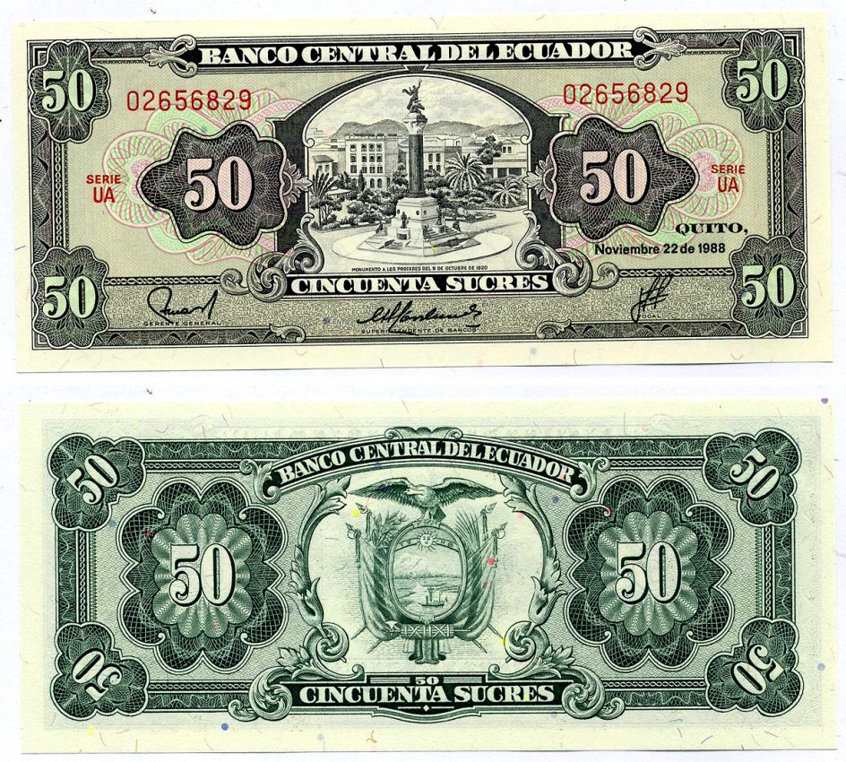 -Эквадор 50 сукре 1988 22 ноября 1988, серия UA, первый тип подписи Pick 122 а бумага UNC (пресс) 00-00АргентинаСШАКолумбияКоста-РикаКубаМексикаНидерландские АнтилыНикарагуаПарагвайПеруСуринамКанадаТринидад и ТобагоУругвайЧилиЯмайкаВосточно-Карибские штатыГренландияКаймановы островаБермудские острова (Бермуды)Багамские островаДоминиканская РеспубликаБарбадосБелизБоливияБразилияВенесуэлаГаитиГайанаГватемалаГондурасДругие страны