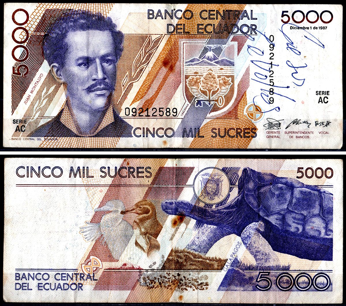 Эквадор 5000 сукре 1987 Редкий год Pick 126a AC(1) бумага 3295-110-1-2