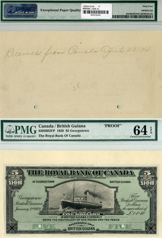 Британская Гвиана 5 долларов = 1 фунт 10 пенсов 1920 Королевский Банк Канады, 2 января 1920, пароход, образец, в слабе PMG 64 Choice Uncirculated "PROOF" Pick S136 бумага UNC (пресс) 10-2-9