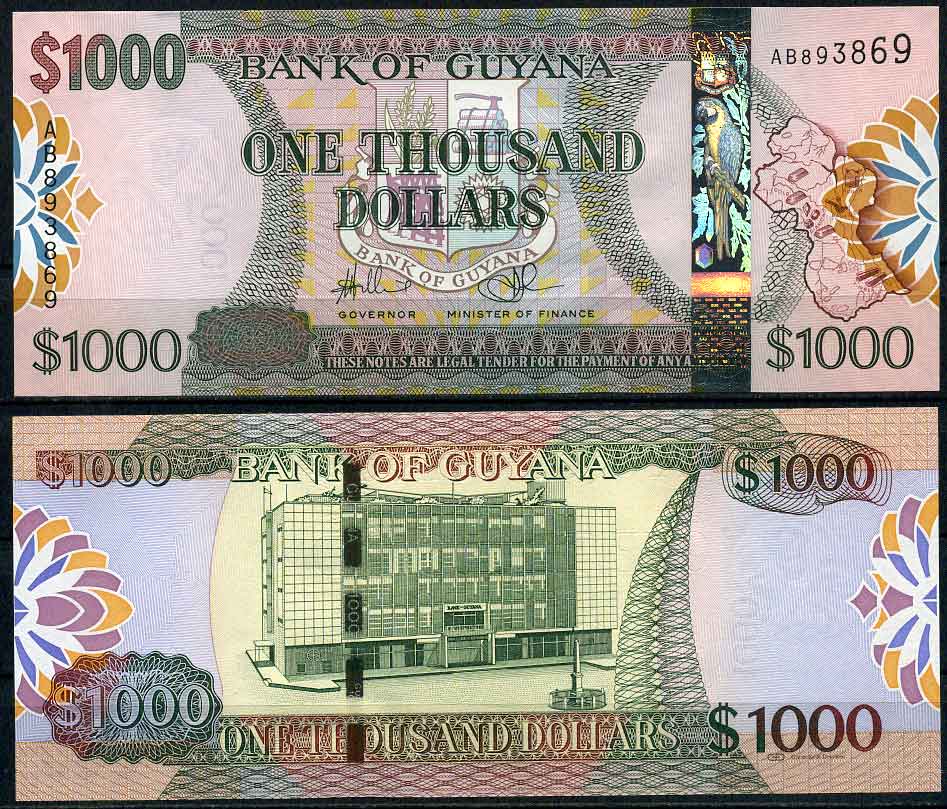 Гайана 1000 долларов ND (2011-2019) серия AB, здание Банка Гайаны Pick 38 (1) бумага UNC (пресс) 447-57-2