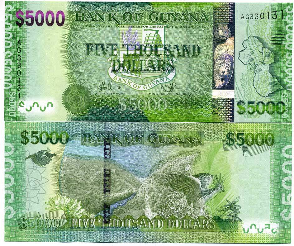 Гайана 5000 долларов ND (2013) карта Гайаны, природный ландшафт, попугай Pick 40 a (1) бумага UNC (пресс) 451-231-1