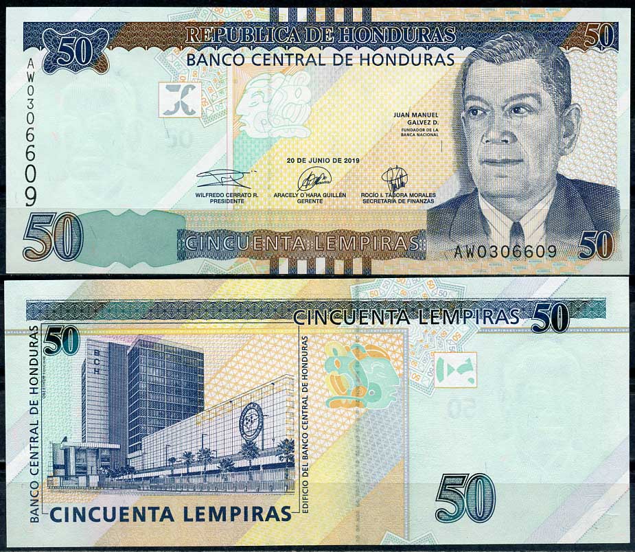 Гондурас 50 лемпира 2019 Хуан Мануэль Гальвес, здание Центрального банка в Тегусигальпе Pick 104 бумага UNC (пресс) 447-103-3