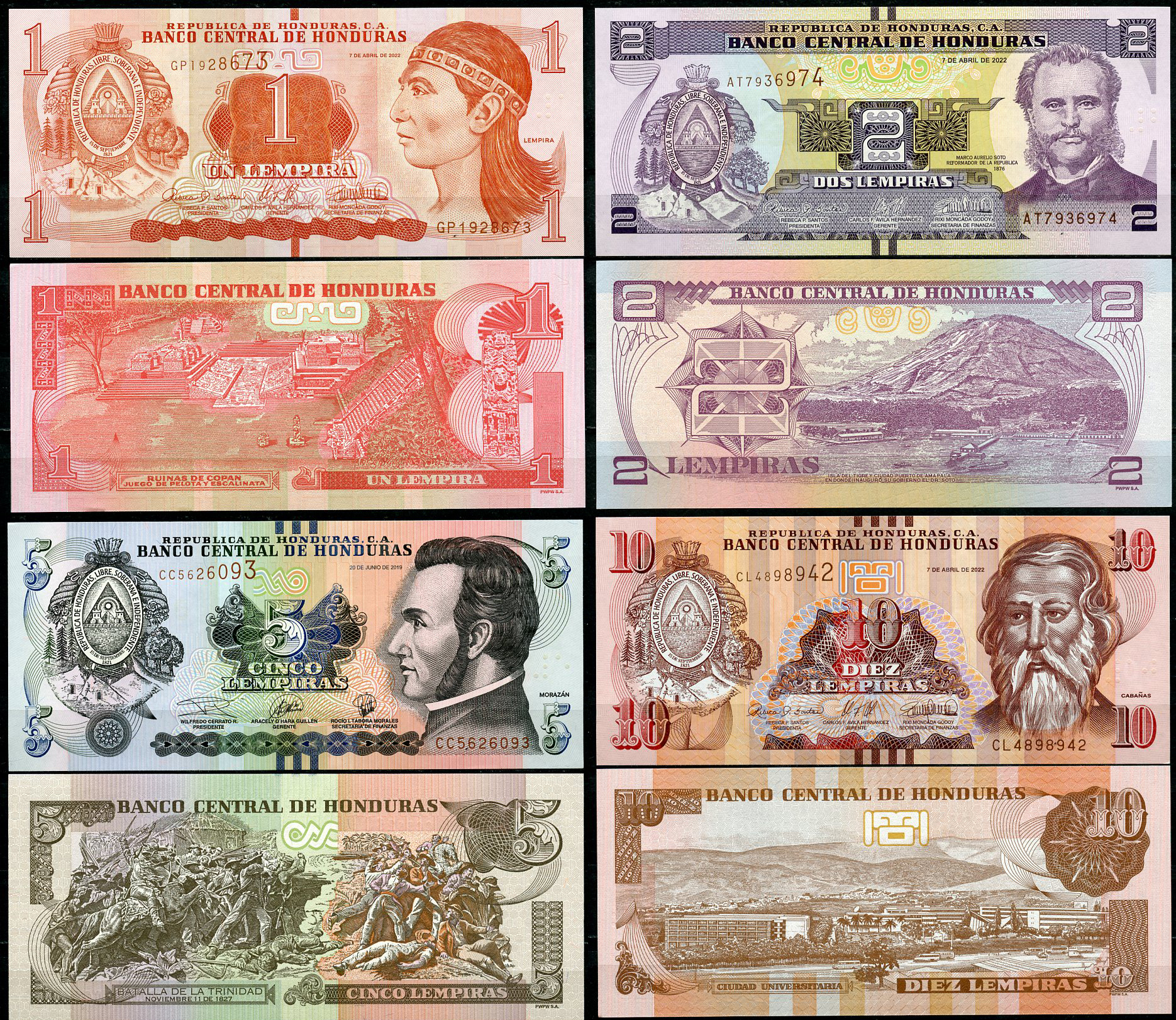 Гондурас набор из 4 банкнот (1, 2, 5 и 10 лемпира) 2019, 2022 Pick 96, 97, 98, 99 бумага UNC (пресс) 450-73-2