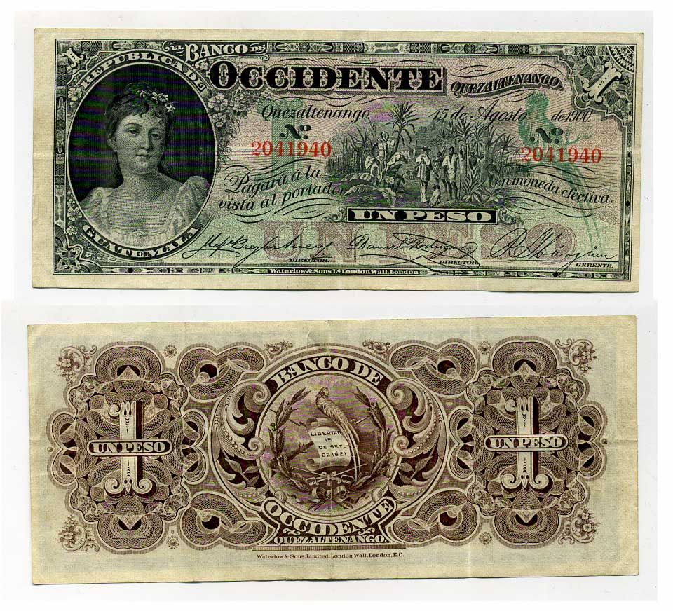 Гватемала, Кесальтенанго 1 песо 1900 Banco de Occidente Pick S175 a бумага VF 000-00-00