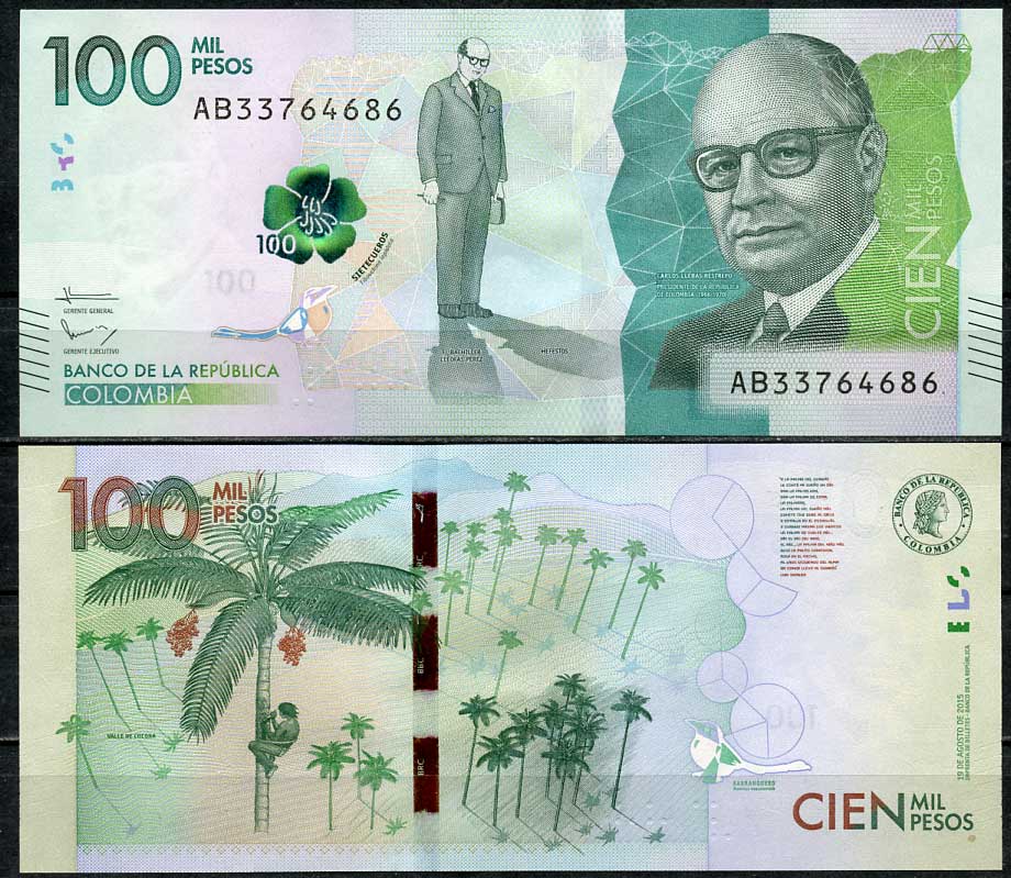 Колумбия 100000 песо 2015 Карлос Льерас Рестрепо, восковые пальмы в долине Кокора Pick 463 бумага UNC (пресс) 451-672-2