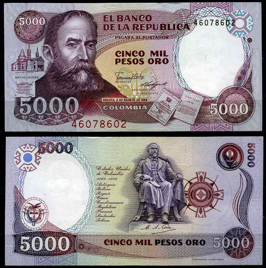 Колумбия 5000 песо 1986 100 лет конституции Колумбии, Рафаэль Нунес, Мигель Антонио Каро Тобар Pick 434 a бумага UNC (пресс) 447-23-2