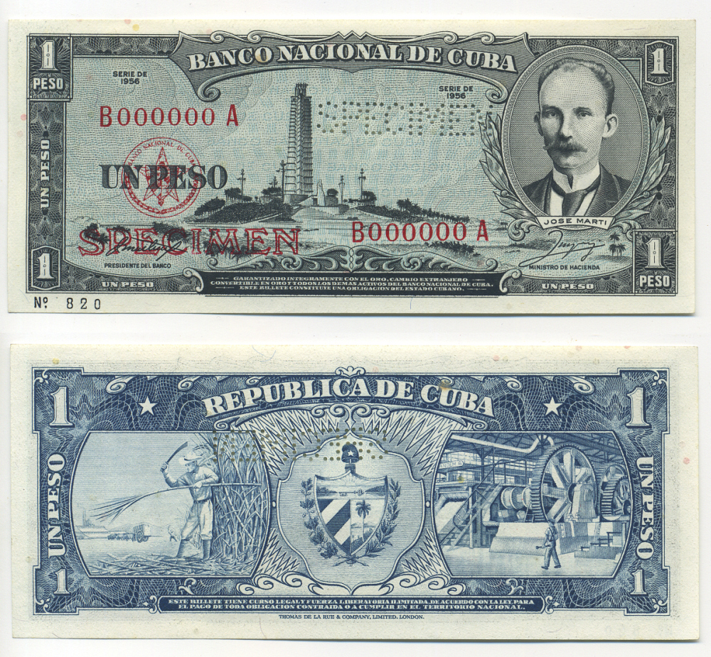Куба 1 песо 1956 Specimen, перфорация, В000000А Pick 87s1 бумага UNC (пресс) 000-000-00