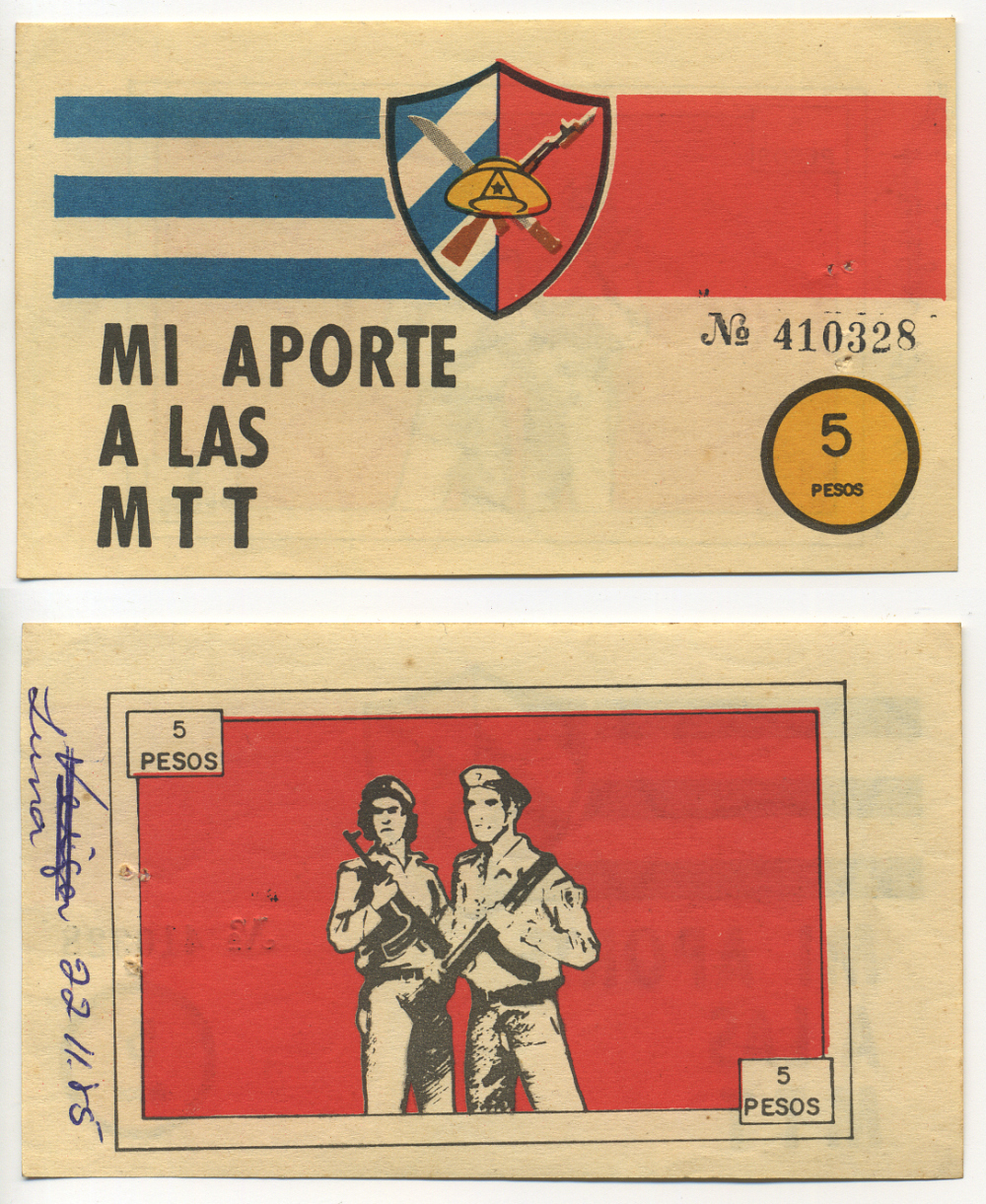 Куба, революционный выпуск 5 песо ND мой вклад в обеспечение МТТ (территориальные милицейские войска) бумага аUNC 8616-55-3-2