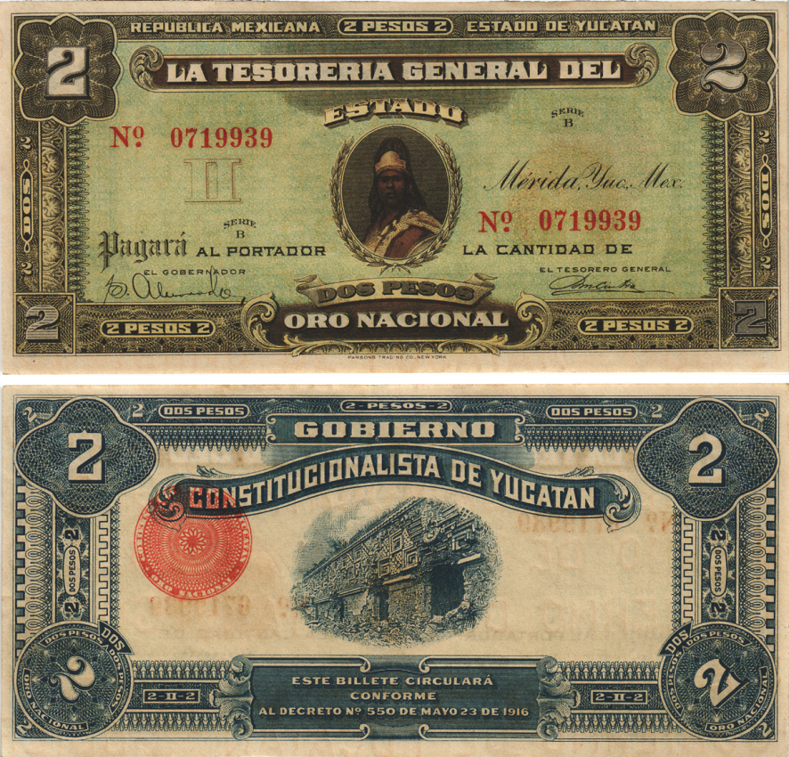 МЕКСИКА, РЕВОЛЮЦИЯ 2 ПЕСО 1916 ПРАВИТЕЛЬСТВО КОНСТИТУЦИОНАЛИСТОВ, КАЗНАЧЕЙСТВО ШТАТА ЮКАТАН Pick S1136 бумага 6278-31-2
