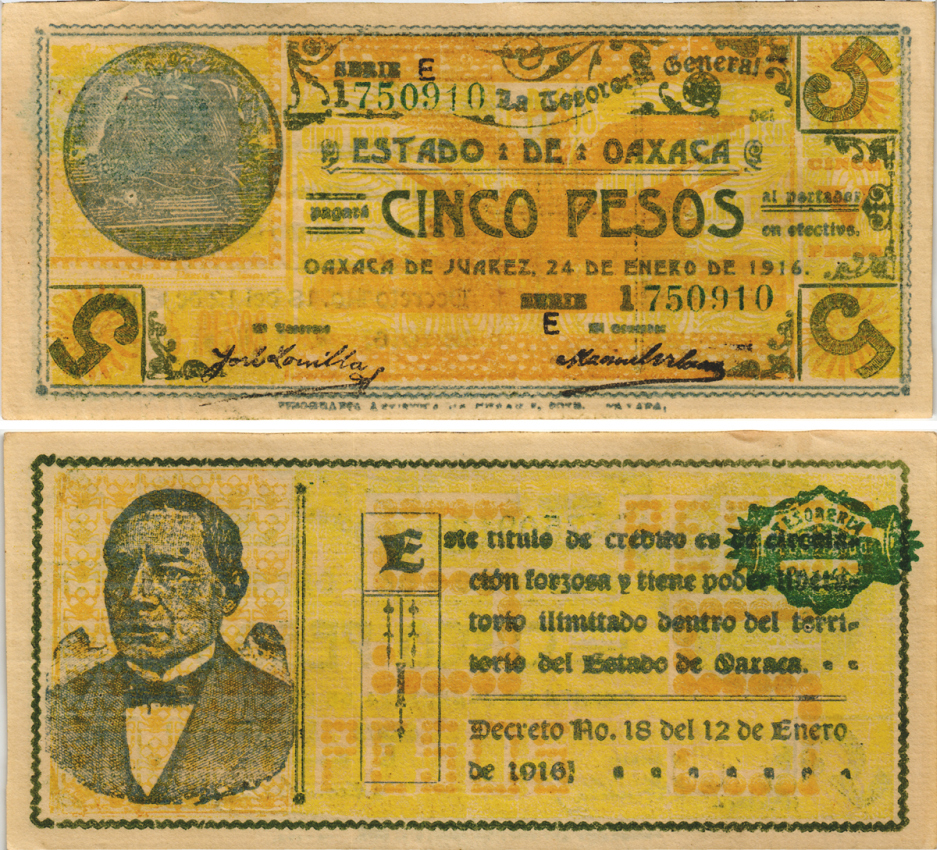 МЕКСИКА, РЕВОЛЮЦИЯ 5 ПЕСО 1916 ОАКСАКА, КАЗНАЧЕЙСТВО, ХУАРЕС Pick S954 бумага 6287-12-1
