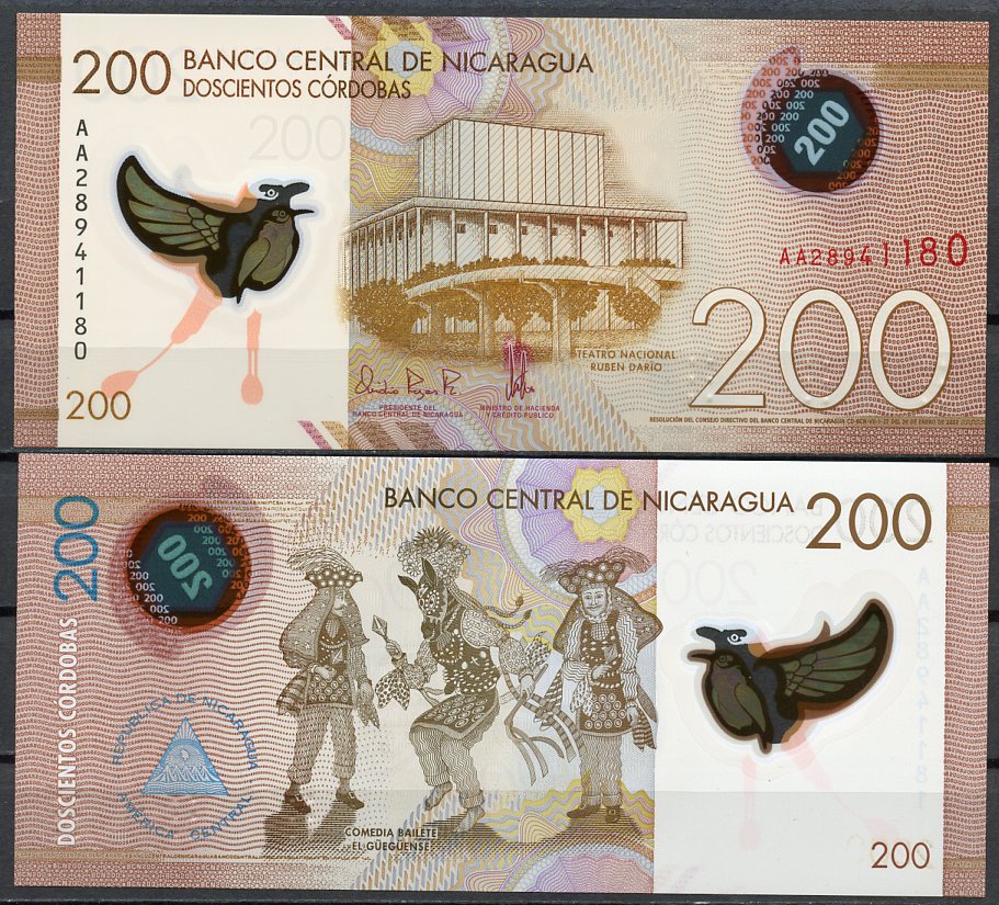 Никарагуа 200 кордоба 2022 национальный театр Рубена Дарио, Манагуа, комедийный балет Гуэгуэнсе Pick 213 a пластик UNC (пресс) 449-80-3