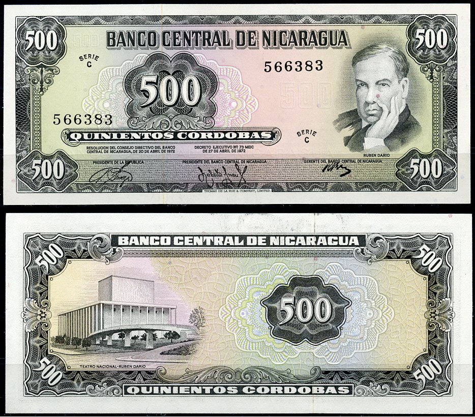 Никарагуа 500 кордоба 1972 Рубен Дарио, Национальный театр, Манагуа Pick 127 a бумага UNC (пресс) 451-805-1