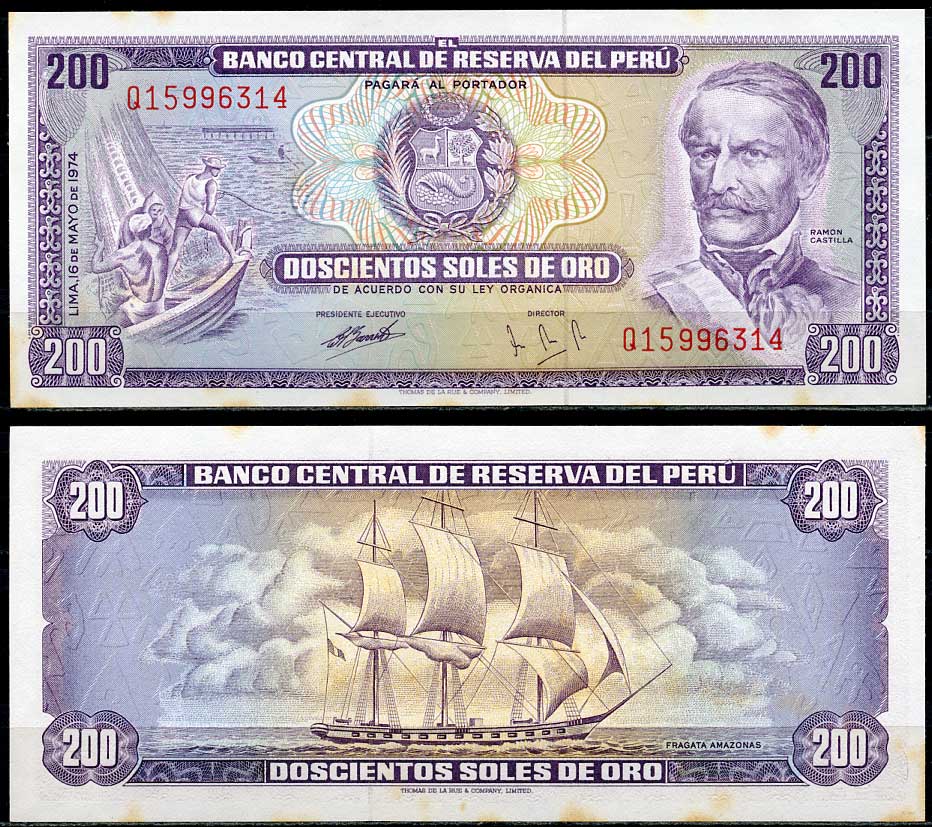 Перу 200 солей 1974 Рамон Кастилья, фрегат Амазонас Pick 103 b бумага aUNC 451-660-1