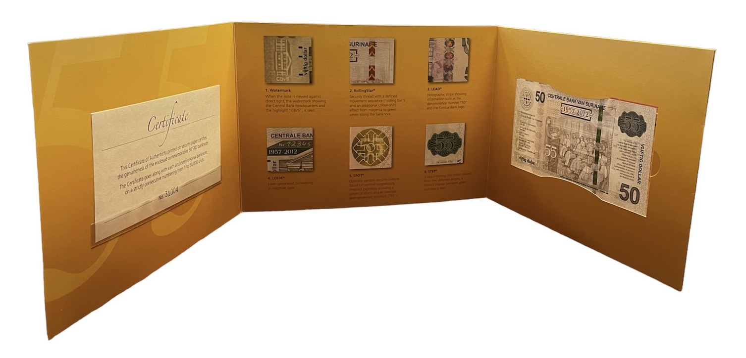 Суринам 50 долларов 2012 55 лет центральному банку (1957-2012), в оригинальном буклете Pick 167 a бумага UNC (пресс) 451-153-1
