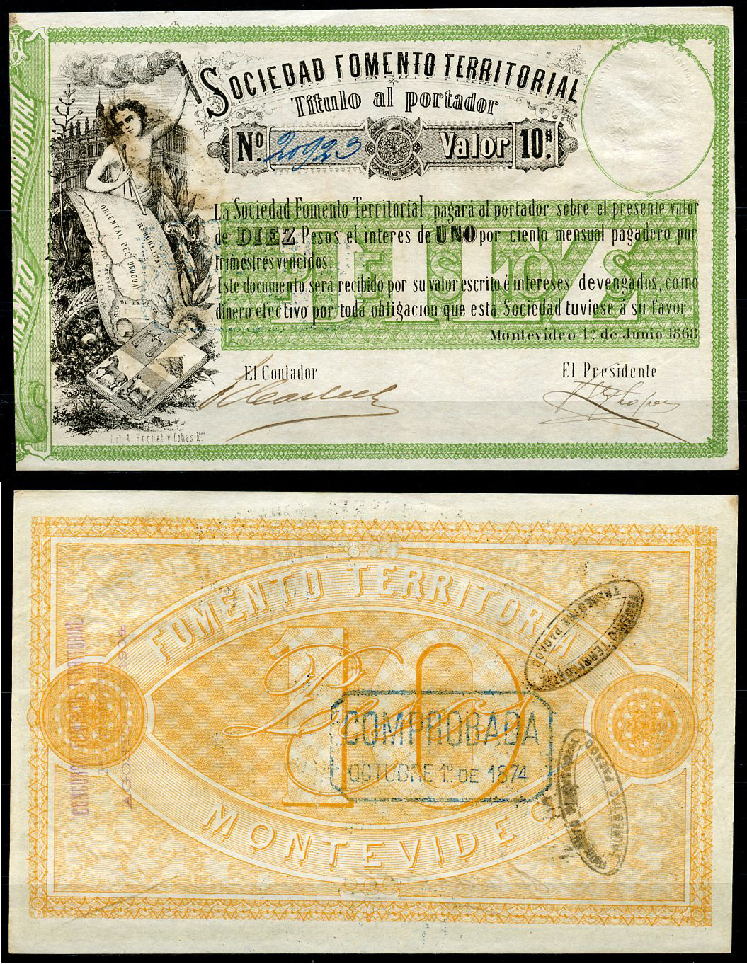 Уругвай, Монтевидео 10 песо 1868 мальчик, карта, № 20923 Pick S481 бумага 451-13-1