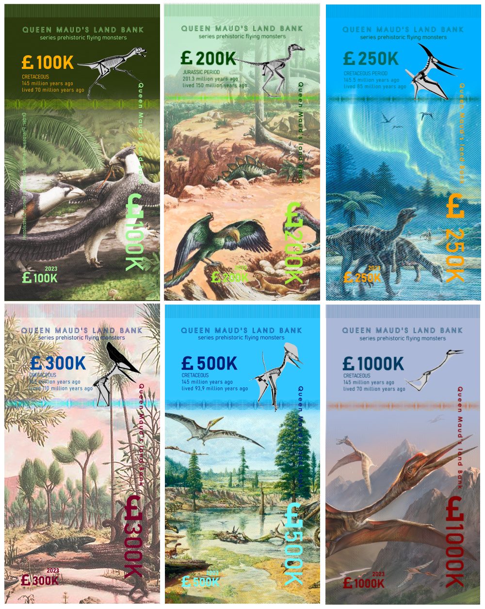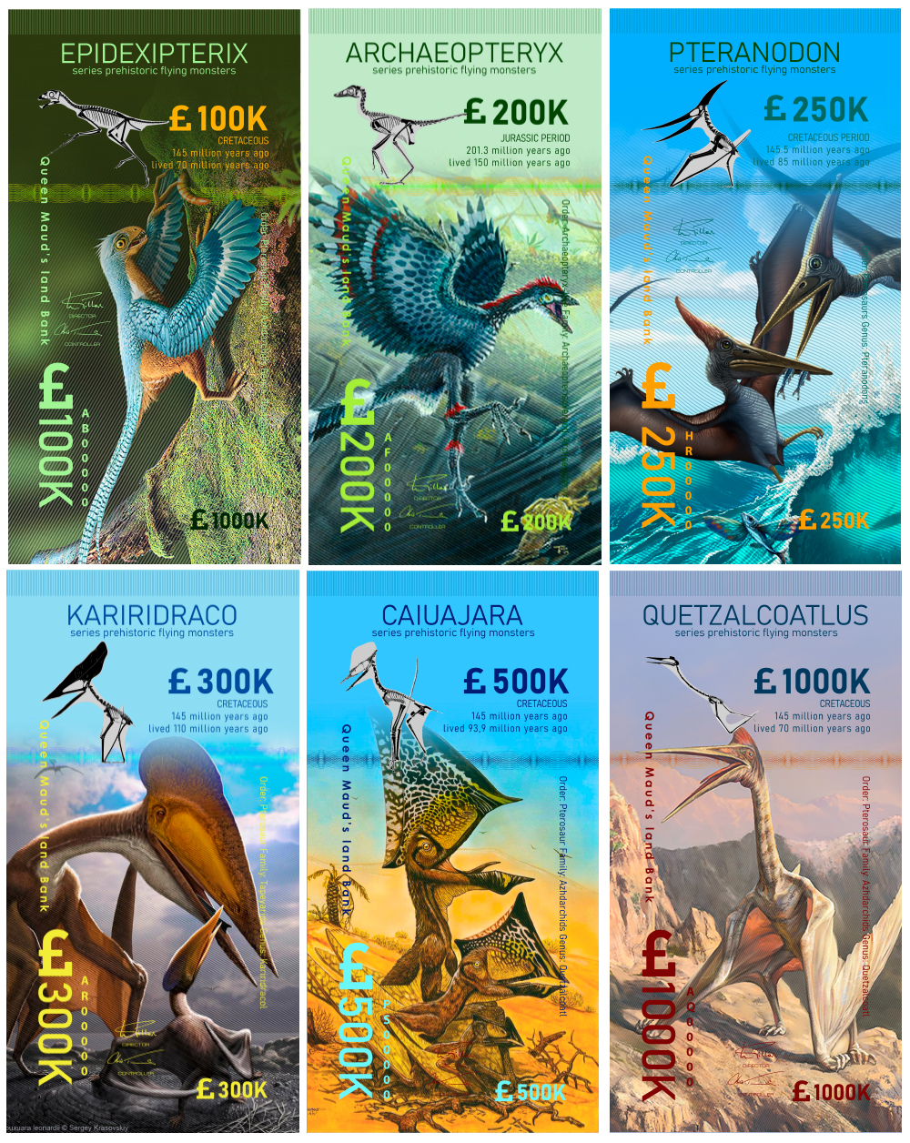 Земля Королевы Мод набор из 6 банкнот ND доисторические летающие ящеры (динозавры) полимерная бумага UNC (пресс) 448-59-2