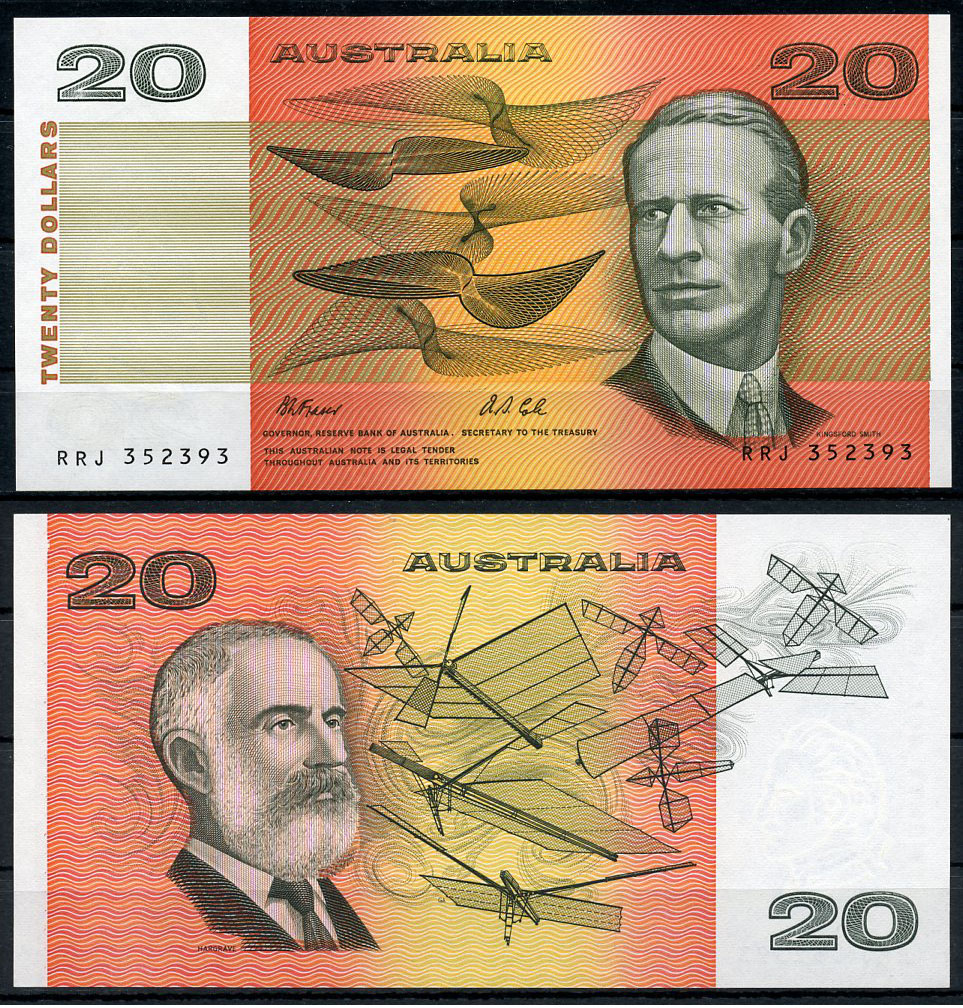 Австралия 20 долларов ND (1974-1994) сэр Чарльз Кингсфорд-Смит, Лоуренс Харгрейв, подпись Fraser - Cole Pick 46 h бумага UNC (пресс) 451-392-3