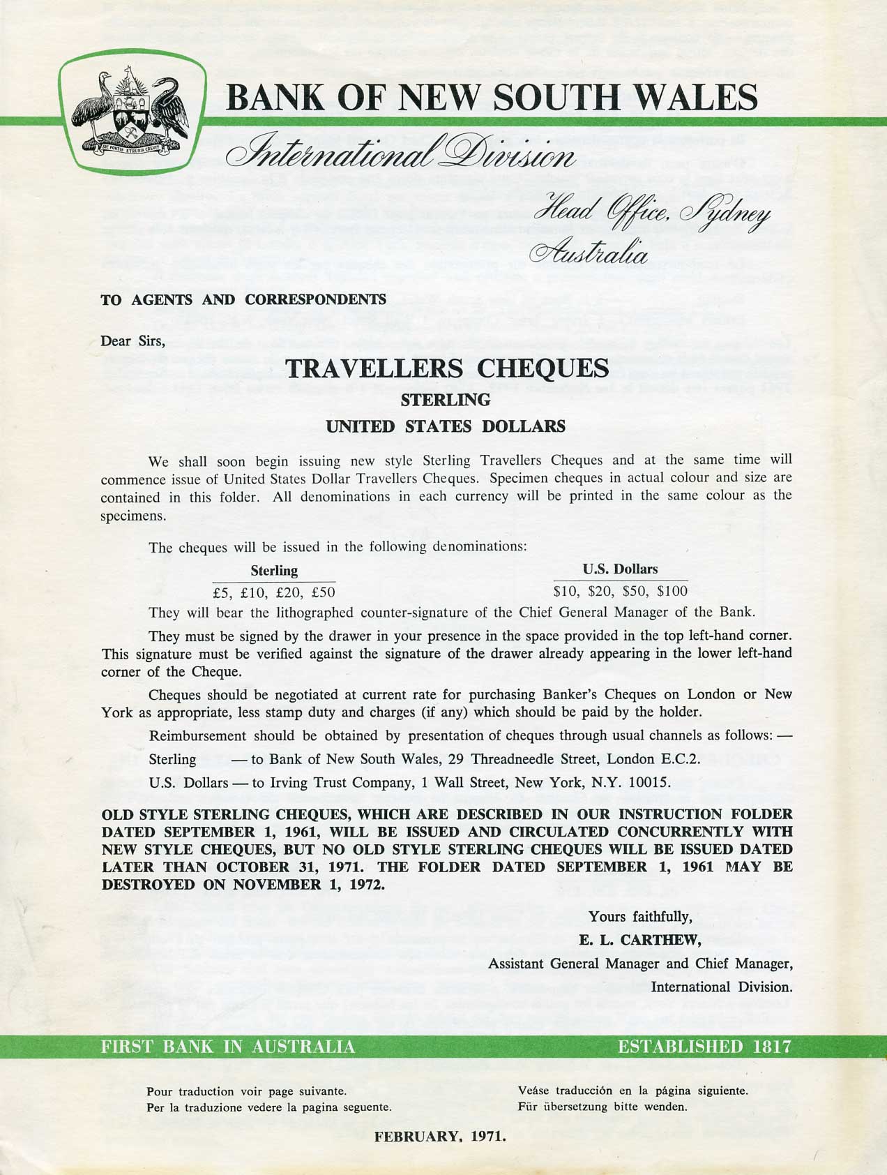Австралия, Банк Южного Уэльса 50 фунтов и 50 долларов 1971 дорожные чеки, оригинальный буклет, образец Specimen бумага UNC (пресс) 5548-4-2-1
