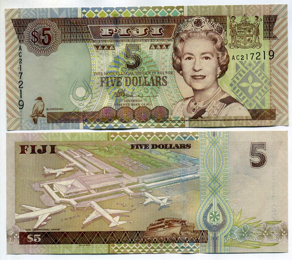 Фиджи 5 долларов ND (2002) Елизавета II (1952-2022), аэропорт Нади Pick 105 b бумага UNC (пресс) 449-24-2
